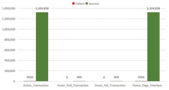 System performance testing is the tests that the system is running, including a stress test, a load test, and so on. In the test of the financial management platform, the Load Runner Tool stress test tool was mainly used. After starting the Load Runner Tool, the function simulates user access and conducts stress tests. In the process of stress testing, combined with the system non-functional requirements, it can be seen that the whole platform can handle 300 concurrent users, with a the duration of about 6 h. The specific platform concurrent user performance test statistics are shown in Table 4 and the test transaction summary is shown in Table 5.