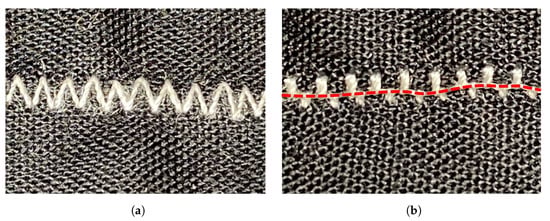 (a) A zigzag stitch is observed on the upper side of the fabric. (b) The same zigzag stitch as observed on the bottom side of the fabric. The dashed red line shows the bobbin thread.