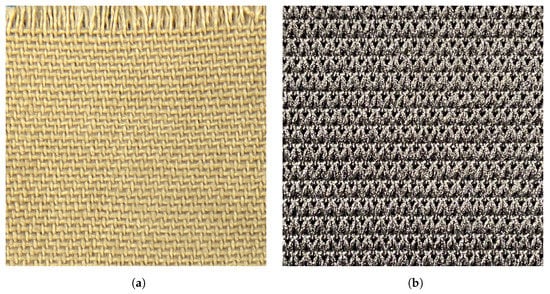 The first material that needs to be considered is the fabric substrate that will be used to attach the embroidered design. This fabric should be made out of a textile structure that allows a certain degree of stretchability without losing its original shape, i.e., the fabric should not deform after being stretched. Furthermore, if the fabric substrate presents a degree of hysteresis after being stretched, the textile strain sensor will also show this non-linear behaviour []. Generally, fabrics can be made by weaving or knitting multiple yarns together. A weaved fabric is constructed by interlacing yarns that are perpendicular to each other (Figure 4a), whereas a knitted fabric is made by looping together consecutive rows of yarns (Figure 4b).
