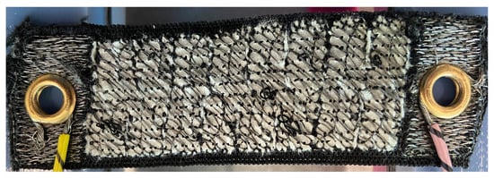 As mentioned before, the sensor was embroidered onto a polyester–rubber elastic knit fabric substrate. This type of fabric was selected as the stretchability of the knit structure combined with the rubber properties of the material, made for an elastic substrate that would regain its original shape after being stretched. Furthermore, the elastic fabric substrate was slightly stretched when placing it on the embroidery hoop; and a double layer of a tear-away stabilizer was used, as it was noted that a single layer caused irregularities in the stitches during the embroidery process. Finally, the sensor was embroidered at 400 stitches per minute (spm), which is the lowest speed that the embroidery machine used could achieve. The reason for using a low speed is to reduce the damage caused to the conductive thread during the embroidery process []. The completed sensor can be observed in Figure 6.