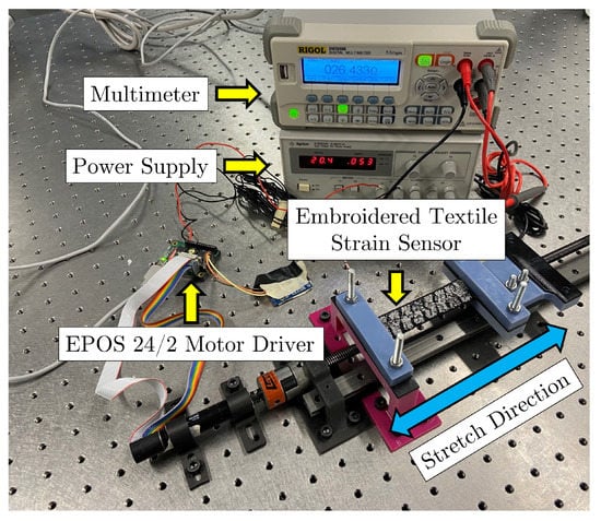 After defining the performance metrics of the embroidered textile strain sensor, three sensor samples were created and left idled at the Wearable Biomechatronics Laboratory for one week, to condition them to the ambient temperature and relative humidity. Then, each sensor sample was tested at an ambient temperature between 22.5 and 23 °C. Data were collected using a DM3058E digital multimeter (RIGOL Technologies Inc., Portland, OR, USA). To reduce any measurement errors due to the resistance of the test probes and the sensor wires, the digital multimeter was configured to perform a 4-wire resistance, as the initial resistance of each sensor was around . Finally, the sampling frequency of the multimeter was set to 2.5 Hz to achieve a resolution of . This resolution was chosen because preliminary testing demonstrated that the change in the resistance of the sensors was around .
