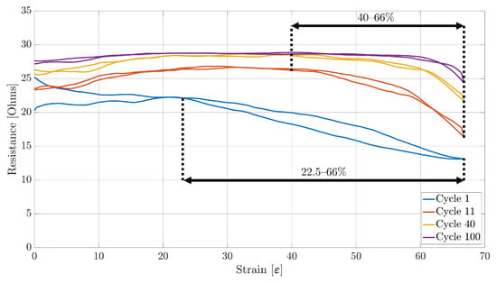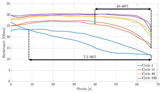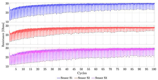 Each of the three sensors were subjected to a 66% strain at a constant speed of 69 mm/min during 100 cycles. The number of cycles was selected so that the performance of the sensors could be compared to the results obtained by Tangsirinaruenart and Stylios [], who used the same number of stretching cycles. The speed was set to obtain as many resistance samples as possible from the multimeter, as the low change in resistance from the sensors made it difficult to obtain enough data as needed, for the further evaluation of the properties discussed in the previous section. With this speed, it was possible to obtain 218 resistance samples during each cycle, which were enough for data analysis. Finally, data from the motor driver and the digital multimeter were sent to a computer that matched the position and resistance data using a custom program written in Python [].