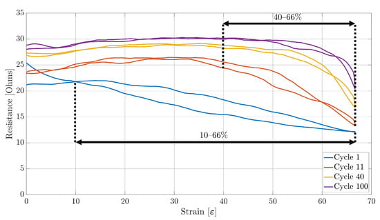 Although the sensors demonstrate a non-repeatable behaviour, this only happens during a few initial cycle iterations. From Figure 15, it can be observed that the performance of the sensor stabilizes after the 40th stretching cycle for all of the three sensor samples. This performance remains constant for the remaining cycles, which is an indication of good repeatability. Furthermore, this behaviour shows that the sensors need to be conditioned by pre-stretching them a couple of cycles before being usable, which is similar to what other studies have found [,]. This pre-stretching is usually necessary because during the first few stretching cycles, some thread slippage may occur [], the thread may suffer from creeping, or some microsnaps may be produced on the fibres that form the conductive thread, which could change its overall resistance.