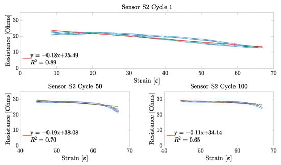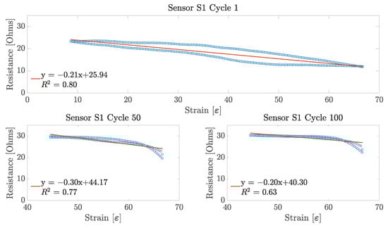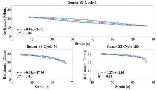 From these figures, it can be observed that, for the particular case of each of the embroidered textile strain sensor, the sensors demonstrated a more linear behaviour during the first stretching cycle. This linear behaviour was consistent during the first 10 cycles for each sensor. However, as the working range of the sensor decreased, so did its linearity. Interestingly, the sensor that showed the highest linearity score during the first stretching cycle was Sensor S2, with an R2 equal to 0.898, followed by Sensor S3 and S1 with an R2 of 0.889 and 0.798, respectively. On the other hand, at the 100th stretching cycle, Sensor S3 had the highest linearity with an R2 equal to 0.738; and Sensors S1 and S2 had a similar low linearity with an R2 of 0.629 and 0.646, respectively.