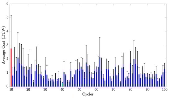 Average DTW cost across the three sensor samples for Cycles 10 to 100. The cost function was computed using the squared euclidean distance for each sensor pair combination. The highest average cost function () was for the 10th cycle (in red), whereas the lowest average cost function () corresponded to the 40th cycle and is shown in green.