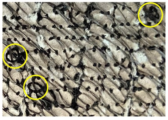 Formation of loops (circled in yellow) underneath the fabric substrate. These loops are produced due to thread tension imbalances that affect the performance of the sensor over a continuous number of stretching cycles.