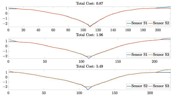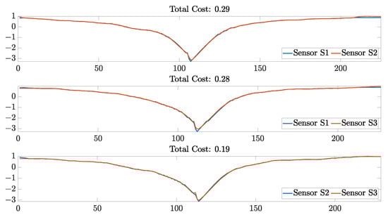 Data shown in Figure 19 correspond to the average cost obtained from sensor pairs that had the lowest DTW scores. It can be observed that the sensor pairs that were the most similar between each other were Sensors S1 and S2. On the other hand, sensor pairs that included Sensor S3 were the ones that had fewer similarities between each other. This could be because during the 10th cycle, specifically, Sensor S3 demonstrated a higher normalized change in resistance, which increased the distance between samples computed during the DTW algorithm. However, as the sensor response stabilized over cycles, as shown in Figure 15, the similarities between sensors increased considerably. For example, during the 40th stretching cycle, all of the sensors had the highest similarity score, with the sensor pair S2 and S3 being the most similar (Figure 20).