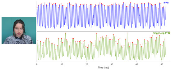 The UBFC-RPPG dataset [24] consists of 42 videos acquired from 42 subjects. The dataset was created by making use of a custom C++ application for video acquisition while filming using a simple low-cost webcam (Logitech C920 HD Pro) with a resolution of 640 × 480 in uncompressed 8-bit RGB format at 30 fps. All experiments were conducted indoors with a varying amount of sunlight and indoor illumination. The subjects were required to be seated one meter away from the camera while playing a sensitive mathematical game that aimed at an augmentation of the heart rate and simultaneously emulating a normal human–computer scenario. Since the mathematical task required the full focus of the subject, they kept staring at the screen during the experiment. Therefore, the face remained always visible in the webcam-recorded video. To receive the ground truth data, a pulse oximeter finger clip sensor (Contec Medical CMS50E) was used to acquire PPG signals synchronized with each video. The experimental setup and an exemplary frame of one video clip can be seen in Figure 1. The duration of the video recordings in the UBFC-RPPG dataset varies from 45.6 s (1368 frames) to 68.4 s (2052 frames).