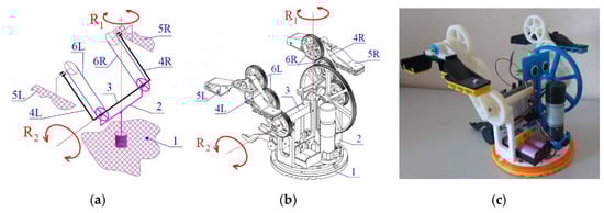 The development of the robot in question went through a few iterations, with the original idea first presented in articles [,] and patent []. The robot has only two degrees of freedom. It consists of a base (base 1), on which the body (body 2) of the robot is connected by means of a vertical rotary joint (with axis R1), in which a shaft (shaft 3) is mounted, which drives the symmetrical arms (legs) 4R and 4L of the robot. Shaft 3 is perpendicular to axis R1. In Figure 1a, the principle scheme of the robot is given; 1b is a 3D model; and 1c is a photo of a 3D-printed robot prototype.