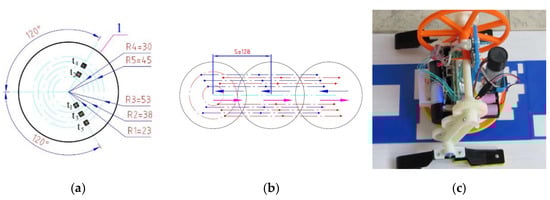 Although the mechanics of the robot is relatively well studied both theoretically and experimentally, its sensor systems and possibilities for exploring the surrounding environment are discussed in only one article []. The 3D printed model of the “Big Foot” robot has five tactile sensors and one force sensor attached to the bottom of the circular base 1 (see Figure 2a). When the robot moves, it steps on the sensors and activates the tactile buttons. As there may be bumps on the surface the robot is moving on, one or more of the buttons may not be pressed and activated. Thus, the walking robot can be used to detect surface irregularities or to “read” inscriptions or drawings that are embossed or indented in the surface (Figure 2b,c).