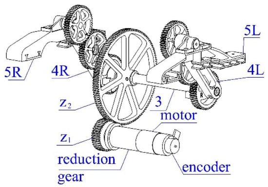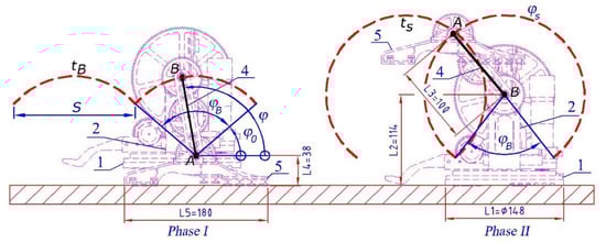 The considered construction of the “Big foot” robot uses two motor reducers of type FIT0277 (12 V-Motor: DC; with encoder, with gearbox; 12VDC; 230 mA; 146 rpm; 51:1) with magnet encoders. The output shaft revolutions are 146 RPM. From the transmission’s (see Figure 5) gear ratio, , of the motor’s parameters, we obtain the maximal value for the angular velocity and angular acceleration for the angular acceleration of the links 4L and 4R. Thus, we are able to determine the least possible durations, , for the phases I and II.