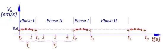 Note that there is forward movement only during the first phase of walking (when the feet are on the ground). During this phase, we have . The robot’s velocity–time graph is provided in Figure 4.