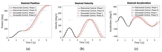 Thus, Equations (15)–(22) set the sinusoidal motor control laws, while Equations (26)–(33) set the polynomial motor control laws. Figure 6a–c shows a comparison of the angular position, velocity, and acceleration assignments during the entire motion for one period, T, under the two control laws.