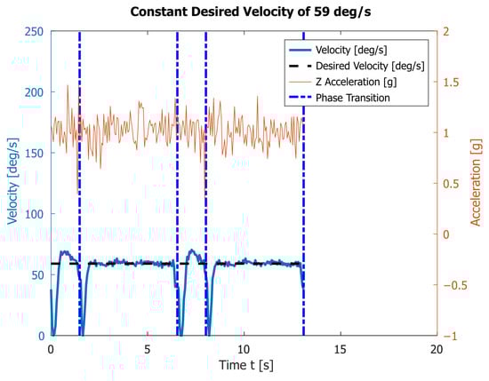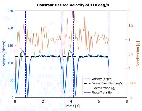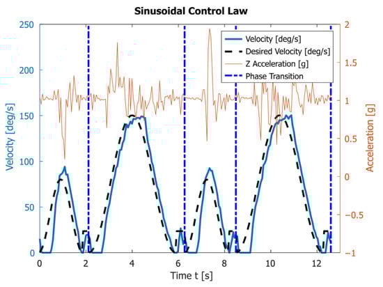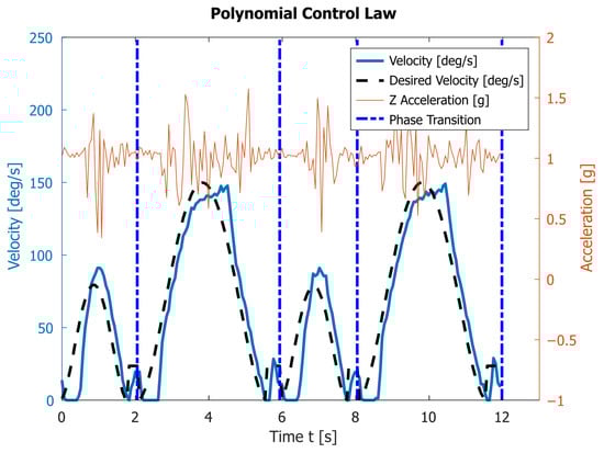 Figure 7, Figure 8, Figure 9 and Figure 10 also contain the accelerations normal to the walking surface (labeled Z-axis) read by the accelerometer. One could notice that the application of polynomial and sinusoidal control laws (Figure 9 and Figure 10) lead to much lower values than the accelerations obtained with the maximum angular velocity given in Figure 7. These accelerations are close to those obtained in Figure 8 at the average angular velocity. An important advantage of both laws is that they significantly shorten the execution time of each period while keeping low values of accelerations along the Z-axis. This corresponds to small dynamic loads.