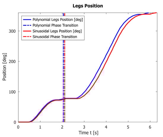 A comparison of the angle change (legs’ positions) when using polynomial and sinusoidal law is shown in Figure 11.