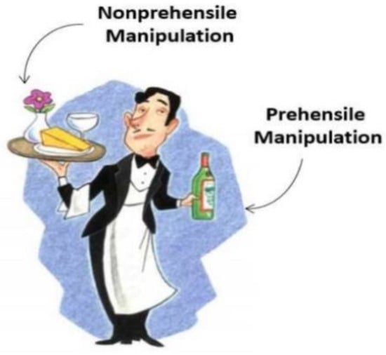 The deployment of robotics in the industry, in one way or another, can be traced back almost 50 years. Usually, robotic manipulations can be divided into two kinds: prehensile and non-prehensile manipulation. Prehensile motion [] involves grasping or capturing, whereas non-prehensile motion [] is where propelling or pushing is involved instead of grasping. An example of prehensile and non-prehensile motion is shown in Figure 1 from []. Well-learned coordination between these two robotic manipulations can lead to higher success rates of pick-and-place; for instance, non-prehensile manipulation can create space between tightly packed objects, thus making grasping possible.