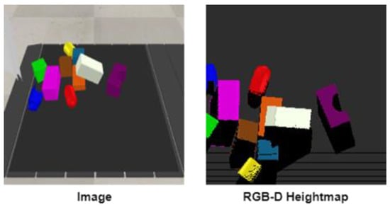 - s ∈ S (RGB-D heightmap), where RGB-D heightmap represents the heightmap generated from the current scene of the workspace at any time instance. In this approach, we used vision sensors to obtain the view of the current state of the workspace. Two types of vision sensors were used in the environment: an orthographic projection vision sensor and a perspective projection vision sensor. The basic difference between these two is their field of view. Orthographic projection vision sensors have a rectangular projection view, whereas perspective projection vision sensors have a trapezoidal field of view. Figure 2 shows the location and fields of view of these vision sensors in our designed simulation setup. We captured RGB-D images through these fixed position vision sensors and aggregation was performed to gather maximum RGB and depth information. Basically, an RGB-D image constitutes an RGB image and its corresponding depth image. A depth image contains information relating to the distance of the surfaces of scene objects from a viewpoint, which, in our case, was the height-from-bottom information. While an RGB image has three channels (red, green, and blue), the depth image has one channel in which each pixel is in relation to the distance between the image plane and the corresponding object in the RGB image []. From these RGB-D images, we created RGB-D heightmaps. We followed the method of heightmap computation from the RGB-D images used in [] where the RGB-D data are projected onto a 3D point cloud, which is then orthographically back-projected upwards in the gravity direction, leading to a heightmap representation of the workspace with both color (RGB) and height-from-bottom (D) channels. Thus, each RGB-D heightmap representation was taken as the state st at time t, as shown in Figure 3. The RGB-D heightmaps created through this process comprised 224 × 224 pixels—the size of our workspace. Each pixel in the heightmap represents a unique three-dimensional location in the physical workspace.