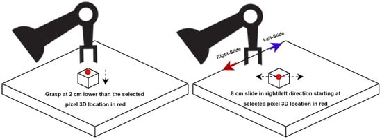 - a ∈ A: (grasp, left-slide, and right-slide), where grasp, left-slide, and right-slide are three unique available actions in this MDP. We designed each robotic manipulation as a distinct action, i.e., grasping (prehensile), left-slide and right-slide (non-prehensile). The motive behind choosing actions from both categories is that non-prehensile manipulations will assist and lead to prehensile manipulation. Each action , at a given time t, will be performed at a three-dimensional location corresponding to a pixel of the RGB-D heightmap or state . This formulation can be seen as , where is the mid-point of the grasping. As we have top-mounted vision sensors, our grasping will be carried out from above using an RG2 gripper [], which is a parallel-jaw grasper that went approximately 2 cm deeper than the ’s z coordinate, as shown in Figure 4, for a firm grasp. On the other hand, if left-slide or right-slide is to be performed, is the three-dimensional location that will serve as the starting point of an approximately 8 cm linear straight push with the tip of the closed parallel-jaw grasper in the left or right direction of the gripper, respectively, as shown in Figure 4. The left-slide and right-slide actions will be performed with reference to the robotic arm and the red and blue arrows show the direction of the right-slide and left-slide, respectively, in Figure 4. For instance, if we imagine ourselves as the robotic arm, our right hand points in the direction of the right-slide and our left hand points in the direction of the left-slide. These grasping and sliding actions can be seen in Figure 5, where Frame 1 shows the grasping action and, upon close inspection, Frames 2 to 6 show the sliding action where the green cuboid object is being slid/pushed by the robotic gripper. To accurately assess the sliding action, one can notice the distance between the green cuboid object and the brown triangular object reducing frame by frame, especially from Frames 4 to 6.Figure 4. Grasp action (left) and left-slide and right-slide actions (right).Figure 5. Frame 1 shows the grasping action whereas Frame 2 to Frame 6 show the sliding action being performed on the green square object.