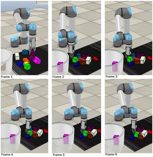 On the other hand, prehensile manipulation will pick objects and facilitate collision-free and more accurate pushing. A substantial amount of work has been conducted on prehensile and non-prehensile robotic manipulations in the past, but mostly, they have been researched independently of each other []. There is still a considerable research gap and potential for exploration in the area of the combination of these robotic manipulations. Non-prehensile manipulation has been primarily used to accurately deal with the poses of the objects []. In a combined approach involving grasping and pushing, pushing goals are quite flexible; for example, they can create space between objects, change the pose of objects, and crack clutter []. This flexibility factor was not addressed in different model-based [,,] and data-driven [,,] approaches in the past. Model-based approaches are those which are based on a static model, whereas data-driven approaches are those which involve any kind of machine learning through data. In the area of prehensile manipulation, there have been different approaches to learning successful grasping policies, some based on optimizing affordances by learning from previous experiences [,,] and some learnt through grasp stability measures [,,]. These approaches do not address the planning or learning of sequences of prehensile and non-prehensile manipulation actions to maximize the success rate of grasping and pushing. There are some hard-coded techniques that are dependent on domain knowledge for implementing single-action push–grasp but, obviously, they have very limited scope [].