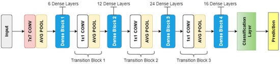 We used deep Q-networks for Q-function approximation to obtain the state-action values that predict the expected future rewards for carrying out an action at a state [,]. The Q-function that we designed is a combination of feed-forward fully convolutional networks (FCNs) []. For more efficient learning of features, we created a distinct FCN for each of the available actions, which are denoted as {}. Each of these FCNs is supplied with state s, which is represented as a heightmap, processes it, and generates a pixel-wise map as the output. The values in this map are the Q-values. As mentioned earlier, the state is represented by a heightmap of 224 × 224 pixels in accordance with the workspace size and the dense pixel-wise map generated by the FCN as the output is also of the same 224 × 224 size. Each value in this dense pixel-wise map corresponds to each corresponding pixel in the heightmap representation of the state. Each value in this pixel-wise map is a prediction of the expected future reward the agent will earn after performing the corresponding action at , with the three-dimensional location corresponding to the pixel . All three FCNs {} have the same architecture, i.e., DenseNet-121 [], whose general architecture is presented in Figure 6.
