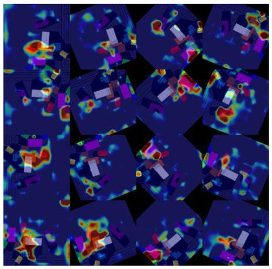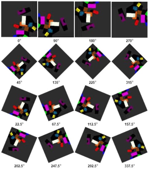 To enhance the learning of features for robotic manipulations, we brought in the rotation of heightmaps. Initially, we rotated the input heightmaps by 90 degrees, leading to 4 rotated heightmaps in total. Later, we experimented with rotating heightmaps at 45 and 22.5 degrees, leading to 8 and 16 rotated heightmaps in total, respectively. Figure 7 shows all three rotation modes; the first row shows the 90-degree rotations, adding the second row shows the 45-degree rotation, and all the rows together show the 22.5-degree rotations. The results show that features were learn better when heightmaps are rotated at 22.5 degrees, generating 16 heightmaps, so that the factor of different orientations is handled well. In this way, each FCN is supplied with 16 rotations of heightmaps and, in turn, outputs 16 dense pixel-wise Q-values maps. So, the total output generated from all the three FCNs {} is 48 dense pixel-wise maps, out of which 16 are for grasping, 16 are for the left-slide, and 16 are for right-slide. Simply put, the 48 maps are an extension of the 16-rotation scheme instead of being two different schemes. Processing was carried out for all three actions (grasp, left-slide, and right-slide) at parallel; each action’s processing obtained 16 rotated pictures, and collectively, they amounted to 48 (16 + 16 + 16). In other words, when we consider a single action, it is 16 inputs and 16 outputs, but when we collectively consider all three action, it becomes 48 inputs and 48 outputs. In all these Q-values from the total 48 dense pixel-wise maps, the maximum one is selected for the particular action corresponding to the FCN it is generated from. Action was performed on , the three-dimensional location of the pixel whose corresponding maximum Q-value was selected. This is depicted as in Equation (3).