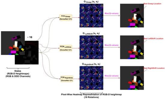 The flow of the whole approach is shown in this figure. RGB-D heightmaps comprising RGB and DDD channels generated as state representations are rotated by 22.5 degrees and all 16 rotations are fed to all three FCNs {FCNGrasp, FCNLeftSlide, FCNRightSlide} based on DenseNet-121 architecture. A pixel-wise map of affordances is generated by each FCN against each rotation of RGB-D heightmap. This map constitutes Q-values, shown in the heatmap format. The maximum Q-value is chosen out of all 48 pixel-wise maps for relevant action to be performed.