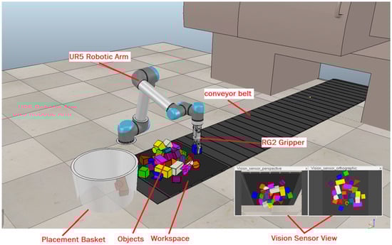 V-REP provides various motion planning calculation modules including the forward and inverse kinematics module. Forward kinematics means using kinematic equations, taking joints parameters as inputs, to calculate the position of an end-effector, whereas inverse kinematics is the reverse process, calculating joint parameters for the given position of an end-effector []. The collision detection module is another important module in V-REP used to highlight collisions if there are any. We used the UR5 robotic arm [], a well-known cobot, for our approach, which is a 6-degrees-of-freedom robotic arm, and we used an RG2 gripper for grasping and sliding purposes. The whole simulation scene designed in V-REP can be seen in Figure 11. A conveyor belt was used in our experimentation. A ray-type infrared sensor is installed at the workspace end of the conveyor belt. The conveyor belt keeps moving, and as soon as the clutter of objects reaches the infrared sensor and breaks the ray, they are detected by the sensor. The sensor resultantly sends a signal to the conveyor belt controller to stop and to the vision sensor controller to capture the workspace RGB-D images for processing. As the workspace clears, the infrared sensor ray is reinstated and the conveyor belt starts moving again, thus bringing the next clutter, and in this way, the cycle continues.
