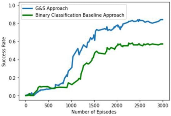 To evaluate the performance of our agent, we compared it with a deep learning baseline framework. We name our original approach G&S, which is the abbreviation for grasp and slide. The baseline approach is quite like our original approach. It is also designed around the idea of pixel-wise parameterization, but it is a deep learning-only-based supervised binary classification approach, i.e., there is no RL component. The same method of state representation and the same number of actions are formulated. As the number of actions is the same in both cases, the same number of FCNs are used. Like the concept of the original approach, each FCN will generate a dense pixel-wise map of affordances for the corresponding action. The only difference will be that the FCNs will be trained with binary classification (0 and 1) in a supervised manner and will generate a dense pixel-wise map of affordance values between 0 and 1. The labels for supervision will be generated on the basis of the success of grasping and sliding so that if grasping is successful, leading to placement of the object in the basket, it will be labeled as 1, and otherwise, as 0; moreover, if a change is detected in the workspace scene after left- or right-slide action is performed, it will be considered successful and labeled 1, and otherwise, as 0. Backpropagation was also performed in the same manner as in our G&S approach, as gradient passing was only performed through a particular FCN and pixel , which gave the maximum corresponding value in the pixel-wise dense map for action selection, whereas 0 loss was backpropagated for all the remaining pixels. This supervised learning approach policy is considered greedy as it will go for the action with the maximum pixel-wise affordance value at any timestep. This baseline approach revolves around the concept of a pixel-wise affordance-based grasping approach designed in [], but for an accurate comparison, we used similar DenseNet-121 [] architecture and weights from the pretraining on ImageNet []. The comparison of the performance of our agents trained from scratch using the G&S approach and the baseline binary classification approach can be seen in Figure 12. In this comparison, both agents were trained for 3000 episodes, where each episode involved 10 randomly chosen regular- and irregular-shaped objects and ended when all the objects were placed, or at least ten actions consecutively failed to bring any change to the workspace. The blue line represents the success rate of our G&S approach, which is around 84%, and next to it, the green line represents the success rate of the binary classification approach, which is around 57%. This measure of success rate is estimated as the number of successfully placed objects in the episode over the total number of actions performed in the episode. A probable explanation for the reduced efficiency of our baseline binary classification approach may be its greedy approach. Instead of building and following strategies based on future perspectives as our G&S approach does through reward schemes, it focuses only on selecting actions based on the maximum pixel-wise affordance value at the current timestep.