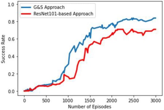 In our G&S approach, we deployed DenseNet-121 architecture pre-trained on a popular ImageNet subset [] comprising around 1,431,167 training, validation, and testing images in total belonging to around 1000 object classes. In our work, we also investigated the role and contribution of pre-trained weights, gained through training over ImageNet, in the learning process and the convergence of our learning policies by training a variant of our original G&S approach from scratch, in other words, involving no pre-trained weights. Figure 15 shows the success rates of both our original G&S approach in the blue line and its variant without pre-trained weights in an orange color. The results show that these pre-trained weights do not play much of a part in the process of learning the pick-and-place task, as the performance of both agents’ is similar. Usually, pre-trained weights are involved in an architecture to decrease training time and increase accuracy. However, this scheme of using pre-trained weights does not make much difference in our case. We surmise that the likely reason may be the different kind of pixels pattern in our RGB-D heightmaps generated by following the approach presented in [] compared to those in the images of the ImageNet dataset. In Figure 15, one can see the success rate’s early curve increase in the orange line, representing the variant with no pre-trained weight. The delayed curve increase of the original G&S approach, represented by the blue line, can be seen in Figure 15. We suspect that the likely reason behind the delayed curve increase is the fact that the agent’s initial training steps were consumed to escape the local optima problem due to pre-trained weights.