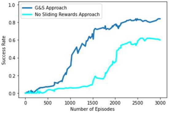 As the motive of our study is to train our agents in such a manner that they can learn the pick-and-place task through a combination of prehensile (grasping) and non-prehensile (left-slide and right-slide) robotic manipulations, we explored the role of non-prehensile actions in the convergence of the policy being learnt through trial and error under self-supervision. To understand the contribution of sliding manipulations to the overall learning of the pick-and-place task, we trained another variant of our original G&S approach with the difference that reward allocation for non-prehensile manipulations (left-slide and right-slide) was discontinued. Rewards were only awarded for prehensile manipulations (grasping) so that whenever an object was moved, the agent earned no reward. Figure 14 shows the performance of the original G&S approach in the blue line and the reward-less sliding variant in the cyan line. Removing rewards for sliding manipulations shows performance degradation of around 22% in terms of success rate. This highlights the importance of the contribution of non-prehensile manipulations in the learning of agents. The delayed rising curve of the success rate depicts the slower pace of the agent in learning the policy because the non-prehensile manipulation rewards are not there; thus, the agent is, by default, learning a policy that is more grasping-oriented. In this situation the importance of sliding manipulation can only be learnt indirectly through the rewards earned through grasping performed in the future after sliding manipulation; therefore, a lower rate of improvement is indicated by the delayed rising curve compared to the original G&S approach.