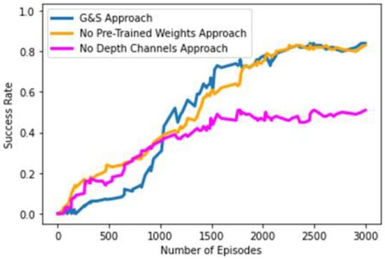 Another element in our approach that is worth exploring is the depth information or the depth channels in our heightmaps. In Section 3.1, we explained that we cloned the depth across three channels to exploit weights pre-trained on ImageNet images. As such, as we already created a variant of our approach which is trained from scratch instead of using pre-trained weights, we removed the depth channels providing information regarding height from the bottom; then, for each FCN, we created only one trunk of DenseNet-121 to learn features from RGB channels instead of two trunks, because no second trunk was required to learn features from the cloned depth channels (DDD), and then, we further concatenated them with the features learnt from the RGB channels. In Figure 15, the magenta line represents the success rate of the variant of our G&S approach, which is trained from scratch without being provided with depth channels for feature extraction, and thus, no information regarding the height from the bottom. Excluding the feature learning from the depth channels led to performance deterioration as the success rate dropped to around 51% over the period of 3000 episodes. This clearly shows that the depth information or height-from-the-bottom information is quite crucial in the learning process of the agent and optimal convergence of the learning policies.