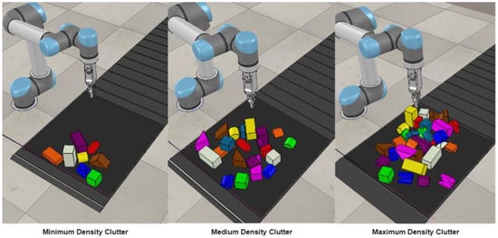 Further, we also reviewed our G&S approach’s performance under unseen circumstances, which were not experienced during the training phases. As described in Section 3.2 during our training phases, the workspace on the conveyer belt has N number of regular and irregular objects in a random clutter and the agent starts picking and placing those objects and keeps on doing it until the workspace is cleared of all the objects. During the training phases, the number of random objects N was kept at 10. After training our agent for 3000 episodes consecutively on a clutter of 10 objects, we tested our agent by varying the clutter density. To bring variations in clutter density, we created three categories of clutter, as shown in Figure 16.