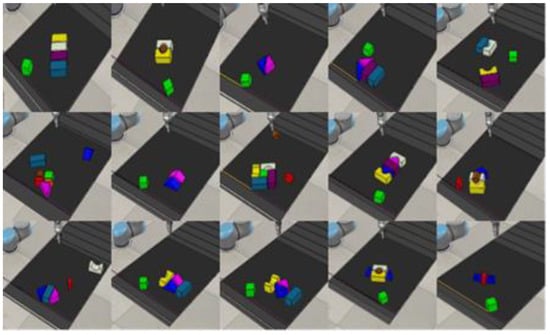 We can see in Table 1 that we compared the grasping success of our agent along with the overall success rate. This grasping success is calculated as the number of successful grasps over the total number of grasps performed in the whole episode. For instance, if 10 grasping actions were performed during the episode and 8 of them were successful, then grasping success will be calculated as 8/10 × 100 = 80%. The results show that our agent performs well in minimum and medium clutter density test cases, but in maximum clutter density, performance degrades a little in both overall success rate and grasping success. The major reason behind this degradation of performance is the factor of objects appearing in the workspace on the conveyer belt at random locations, and due to high density, these objects are placed on each other in random weak poses. This is also visible in maximum density clutter, as shown in Figure 16. As soon as the robotic gripper goes to grasp an object that is weakly posed on other objects, they all slip and fall, leading to failed grasping and degradation of the overall performance. In the case of complicated scenarios, we intentionally placed objects in locking poses such that it became difficult for the agent to pick and place them. For instance, in some places, there was not enough space for grasping or sliding, and at the same time, some objects were too wide to be grasped. These scenarios were met by the agent for the very first time, as the object arrangements were completely random and not hand designed. Another reason for the decrease in overall performance is the smaller number of objects in the scenario. For instance, if the test case has only three objects, the agent clears the workspace in four actions, which is a very good performance, but still, the overall success rate will fall to 3/4 × 100 = 75%. Therefore, we can say that the agent has truly shown its learning in our test cases in a very reasonable manner.