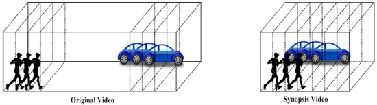 Recently, the research community presented a new smart technology that can create a condensed representation from the original video without losing significant activities from its content. This smart technology is called video synopsis. This technology improves the functionality of the surveillance videos because it helps the final user lessen the browsing hours of the captured video to minutes or seconds. Moreover, video synopsis affords a video condensation technique that relies on activities rather than those based on frames, so it achieves higher efficiency, as it provides the opportunity for better condensation due to its accurate analysis of video details. The video synopsis is generated by shifting all the objects in time to be presented simultaneously and creating a shorter video with a maximum number of activities, as shown in Figure 1. The video synopsis framework incorporates four principal modules: object detection, object tracking, optimization of the cost function to obtain optimal temporal rearrangement, and, finally, segmenting and stitching the objects’ activities to the generated background.