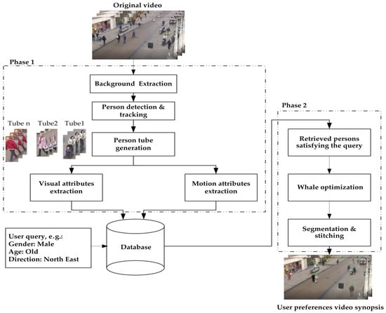 As can be noticed in Figure 2, the first phase commences with the camera monitor selecting the video from the video store that has the required person. Then, the temporal median method is applied to estimate the background. Afterward, the people bounding boxes from the selected video are extracted using the proposed detection and tracking algorithms. Finally, the visual features, comprising gender, age, carrying something or not, having a baby buggy or not, upper clothing color, and lower clothing color, as well as the motion features, according to the motion speed, motion direction, and the person accessing a region of interest, are extracted for each person tube using a person attribute recognition algorithm. On the other hand, in the second phase, the extracted visual and motion features are stored in the database, and according to the user query, the person tubes that satisfy the query are retrieved. Subsequently, a whale optimization algorithm is applied to determine the best starting time of each retrieved person tube that minimizes the synopsis length. Eventually, the retrieved person tubes are segmented and stitched on the estimated background to generate the video synopsis.
