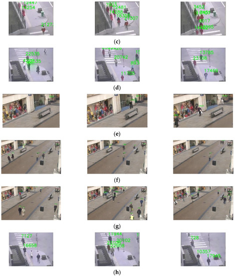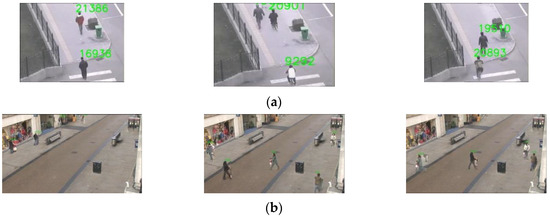 For evaluating the video synopsis performance, Table 3 presents the different metrics to assess the created synopsis. The whale parameters that are empirically determined to generate the synopsis video are initialized as solutions numbers = 50, the logarithmic spiral shape “b” = 0.5, and the search speed parameter value, “a”, decreases from 2 to 0 through the generations. It can be observed from the results in the table that the synopsis video length compared to the original video is decreased by 68% to 93.2%. The variation in the reduction rate depends on the number of persons needed to be stitched in the video synopsis with less collision and a high time correlation between tubes. Additionally, OR values reflect how the proposed algorithm generates the synopsis video with low collision between the persons. Furthermore, it can be perceived that interacting tube pairs are preserved in the synopsis video by 78.6 to 100%. Some interacting tube pairs are not preserved due to the large number of persons needed to be stitched in the synopsis. It can also be remarked that the proposed algorithm reserves the timing order of the tubes in the synopsis video according to the TD values. TD values are approximately very small for queries with a small number of people and increase slightly for queries that return a large number of people. Figure 6 presents some frames of the generated synopsis videos for each query. As an example, Figure 6a shows frame samples from the generated video synopsis by applying Query1, “Males moving in the opposite direction to the camera,” for the Oxford Town Center dataset, while Figure 6b indicates the frames from the synopsis video by applying Query2, “Persons having a baby buggy” on the MCT dataset. The rest of the queries are described in Table 1. As can be seen in the figure, each query is efficiently satisfied, and the synopsis video stitched the relevant persons in a well-organized manner to ensure a pleasing visual appearance.