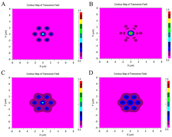 In the simulation, the input power into the outer fiber of the central cone fiber at different wavelengths is normalized to 1, i.e., the optical power is 1 at z = 0 (μm) of the central cone. The mode field distributions at the output of the outer segment of Φ0~Φ6 are recorded by the monitor (Figure 2). The mode field distributions at the output of the outer segments are recorded at 430, 536, 690, and 750 nm. The magnitudes of the monitored mode field distributions at the output of the outer segments are judged according to the color coding of the axis shown on the right side of the figure. As shown in Figure 2A,B, when the light beams with two different wavelengths enter the central cone with the same peak amplitude, the peak mode field amplitudes at the output of the outer segment of the central cone are both higher than those of the surrounding cones. This shows that when light with a wavelength of 430 nm is incident on the central cone, most light energy is coupled into the surrounding cones at the output of the outer segment. The peak mode field amplitude in the central cone is only slightly higher than that in the surrounding cones at a wavelength of 430 nm. At the wavelength of 536 nm, most energy is retained in the central cone, while almost no energy enters the surrounding cones. As shown in Figure 2B–D, in the wavelength range of 536–750 nm, the peak mode field amplitudes of the central cone decrease gradually with increasing wavelength.