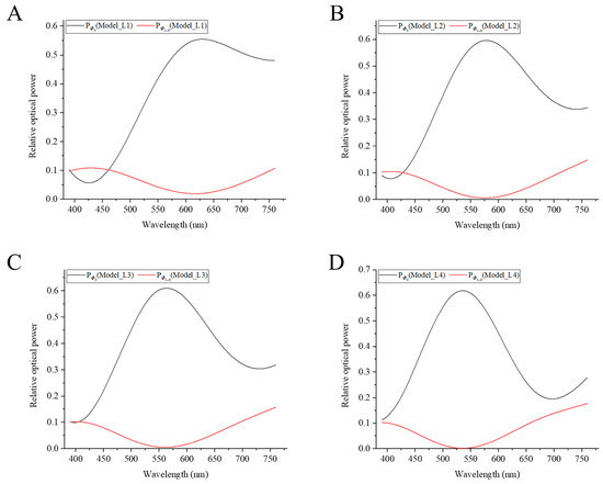Relationship between the relative optical powers at the output of the outer segment and wavelength of the four models L1~L4. (A) L1 = 80 + 11 + 14 + 14 μm. (B) L2 = 90 + 16 + 20 + 20 μm. (C) L3 = 100 + 11 + 14 + 14 μm. (D) L4 = 100 + 16 + 20+ 20 μm. The relative optical power of the Φ0 detected at the output of the outer segment of the central cone is represented by a black curve, and the relative optical power detected at the output of the outer segment of a single surrounding cone Φ1~Φ6 is represented by a red curve.