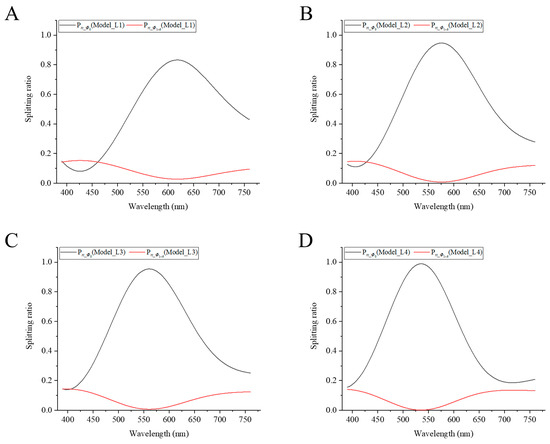 Splitting ratio curves of the central and surrounding cones vs. wavelength in four models, where (A) L1 = 80 + 11 + 14 + 14 μm. (B) L2 = 90 + 16 + 20 + 20 μm. (C) L3 = 100 + 11 + 14 + 14 μm. (D) L4 = 100 + 16 + 20 + 20 μm. The black curve represents the splitting ratio of the central cone Φ0, while the red curve represents the splitting ratio of a single surrounding cone Φ1~Φ6.