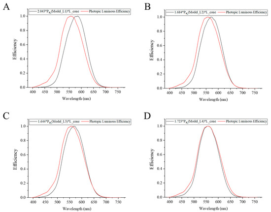 As shown in Figure 5, by taking into account both the fiber coupling effect of the cone photoreceptors and absorption of light, we find that the multiplication of the relative optical power of the central cone by the L cone’s spectral sensitivity is proportional to the isotopic luminous efficiency approximately. Therefore, we apply γ* PΦ0 (Model_Li) * L_cone to fit the photopic curve with i = 1–4, where γ is a normalization coefficient. As shown in Figure 5D, while the peak wavelength is 564 nm in the spectral sensitivity curve of the L cone, the peak wavelength of the fitted curve is shifted near to the peak wavelength 555 nm of the photopic curve. The fitted curve matches with photopic luminous efficiency well, so it shows the dominant role of the L cone in photopic luminous efficiency. Meanwhile, the L cone may contribute to the photopic luminous efficiency the most, followed by the M cone, while the S cone contributes the least [4,5,6,7,8,9,10].