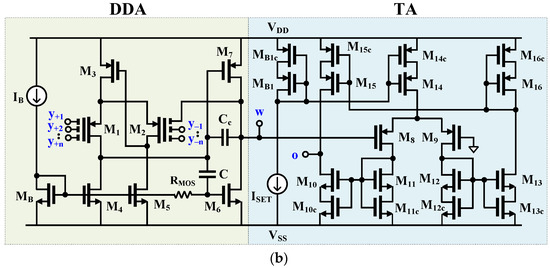 - Shankar, C.; Singh, S.V.; Imam, R. SIFO–VM/TIM universal biquad filter using single DVCCTA with fully CMOS realization. Analog. Integr. Circuits Signal Process. 2021, 109, 33–46. [Google Scholar] [CrossRef]