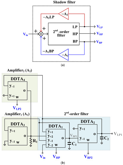 - Abuelma′Atti, M.T.; Almutairi, N. New voltage-mode bandpass shadow filter. In Proceedings of the 2016 13th International Multi-Conference on Systems, Signals & Devices (SSD), Leipzig, Germany, 21–24 March 2016; pp. 412–415. [Google Scholar] [CrossRef]