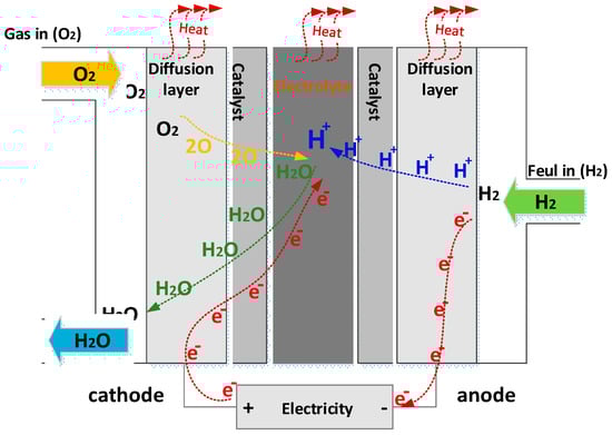 As shown in Figure 3 [25], a fuel cell includes an anode and a cathode, as well as an electrolyte. At the anode, a platinum catalyst splits the hydrogen atom into protons and electrons. While the electrons receive current from an externally applied to produce the FC output voltage, the protons reach the cathode. At the cathode, the protons and electrons are once again coupled with oxygen to produce heat and water.