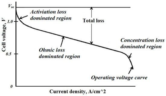 Inside the PEMFC, there are three different types of losses: activation, ohmic, and concentration losses. Figure 4 depicts the fluctuation of PEMFC voltage with cell current density [26].