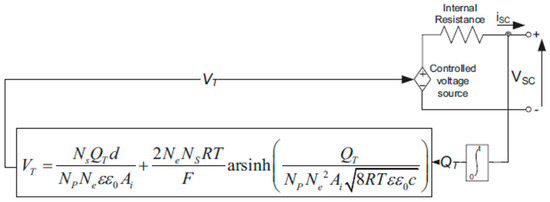 where CT denotes the sum of the capacitances (F), QT represents the entire amount of electricity charged, RSC denotes intrinsic resistance (ohm), iSC is the SC current (A), NS is the number in series, NP denotes the number in parallel, CH is the Helmholtz capacitance (F), CGC represents the capacitance of Gouy-Chapman (F), Ne is the total number of layers of the electrodes, ε and ε0 are the permittivity values of the electrolyte material and empty area, Ai is the space between both the electrodes and the electrolyte (m2), d is the length of the Helmholtz layer (m), Qc would be the electric charge of the cell, C is just the molar concentration (mol m−3).