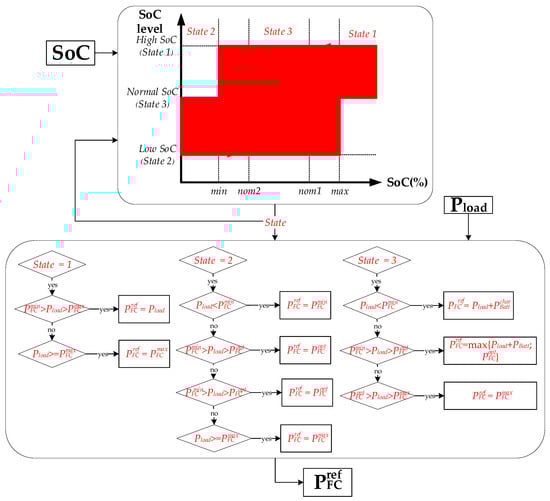 The system’s efficiency depends greatly on the development of MG energy management, which is essential [30,31]. The necessary power by the load in a hybrid system not supplied by the PV array is known as net power (). To provide conversion efficiency, the EMS instructions might control the PEMFC, BSs, and SCs.