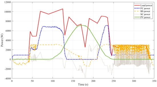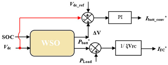 The suggested optimized EEMS-based WSO is used to minimize the consumed hydrogen of a hybrid power system shown in Figure 6. The simulation software model’s S-function incorporates the optimized EMMS-based WSO, which is constructed and provided with the following two input variables: the battery SOC and the load profile, whereas the output, the FC and battery banks, are regulated currents. The optimized EMMS-based WSO is compared with conventional EEMS, SMCS, and PSO. Figure 10 demonstrates the load demand that was used (red curve). As presented in Figure 11, at a time of 5 s no load demand is required, and the PEMS starts recharging the BSs with its optimal power (about 1 kW). At 40 s, with no PV power, the extra load demand required is instantly given by the SCs due to its fast dynamics, while the PEMFC power increases gradually. At 45 s, the SCs are discharged below the reference DC link voltage of 270 V, as presented in Figure 12, and the BSs begin delivering power to adjust the DC link voltage back to 270 V. At 48.5 s, the SCs voltage reaches 270 V, and the BSs decreases its power gradually to zero. The PEMFC provides the total demand and continues to recharge the SCs. At 60 s, a fast change in load occurs, and the SCs provide the extra transient demand while the PEMFC power increases gradually. The PV has not yet delivered any power; this changes at t = 100 s. Throughout this time, the energy generated by the PV increases to contribute to load-shaving while the excess electricity is used to charge the battery and SC. Likewise, when the PV power has a value, the PEMFC power is zero. At t = 250 s, when the battery and SC are simultaneously in the charging mode, the PV is shut off, and the PEMFC returns to share a large amount of load power.