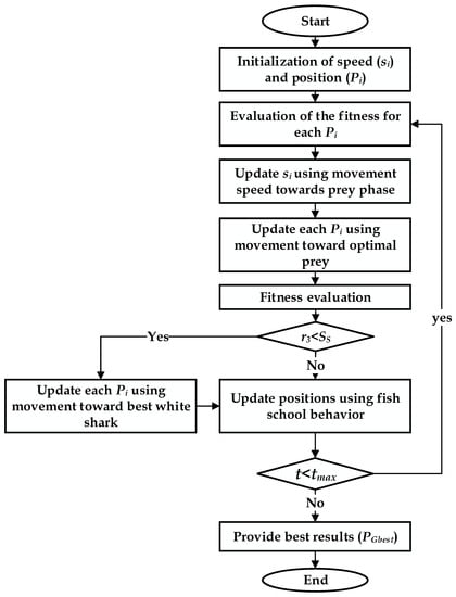 where the index i (i = 1, 2, …, n) expresses the white shark order in a population of size n, s represents the speed, Pgbest reflects the highest strategic standing vector, p is the ith white shark’s present position vector, Pbest is the current best-achieved position, c1 and c2 are two numbers at random from the range [0, 1], p1, p2, and u are calculated according to the following equations: