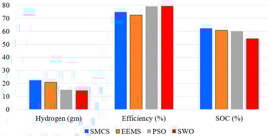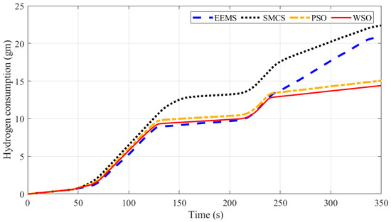 A comparison between different EMSs is presented in Figure 14. Thanks to the proposed EEMS-based WSO, hydrogen consumption has been reduced by 34.17%, 29.47%, and 2.1%, respectively, compared with SMCS, EEMS, and PSO. In addition, the efficiency has been increased by 6.05%, 9.5%, and 0.33%, respectively, compared with SMCS, EEMS, and PSO.