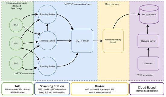 In this work, an IoT-based system was realized and Machine Learning (ML) was used to estimate the position of assets, objects, people, or animals carrying a TAG device in indoor spaces. For such a system, different methodologies, architectures, and frameworks must be considered in order to propose an optimal solution for such an application []. As trilateration is not quite suitable for indoor location estimation, this project considers the fingerprinting technique, in which an intelligent system collects information from RSSI (Received Signal Strength Indicator) levels from the wireless communication between the object to be located and different access points, then associates these collections of RSSIs (fingerprints) to a certain location in space [,,]. Through Bluetooth Low Energy (BLE) technology, a TAG attached to the object to be located sends periodic beacon messages, which are scanned in a fixed time window by Scanning Stations deployed in the environment under study. The scanning stations consolidate and send the information to a server, where a previously trained Deep Learning (DL) model estimates the position of the object utilizing the fingerprinting approach.